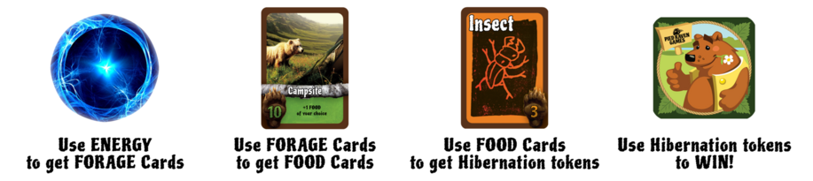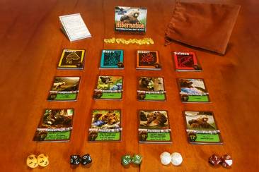 Hibernation is a fun, fast-paced, and easy to learn deck-building card game. Players take on the role of a bear waking from Hibernation, slim and hungry, and must prepare for the next year’s big sleep. Alas, other bears in the ecosystem have become extremely competitive. Players must race to gather food while fending off foes along the way. A deck of cards contains the means of finding food. Each player’s deck starts bare, but they strive to make it a perfect library of food-collecting assets. To do this, they must forage, frenzy, and possibly steal to stockpile their hoard of food. Then, eat their food in proper portions to gain layers of fat. The first one to achieve the five required layers of fat via Hibernation tokens can rest easy – victorious!